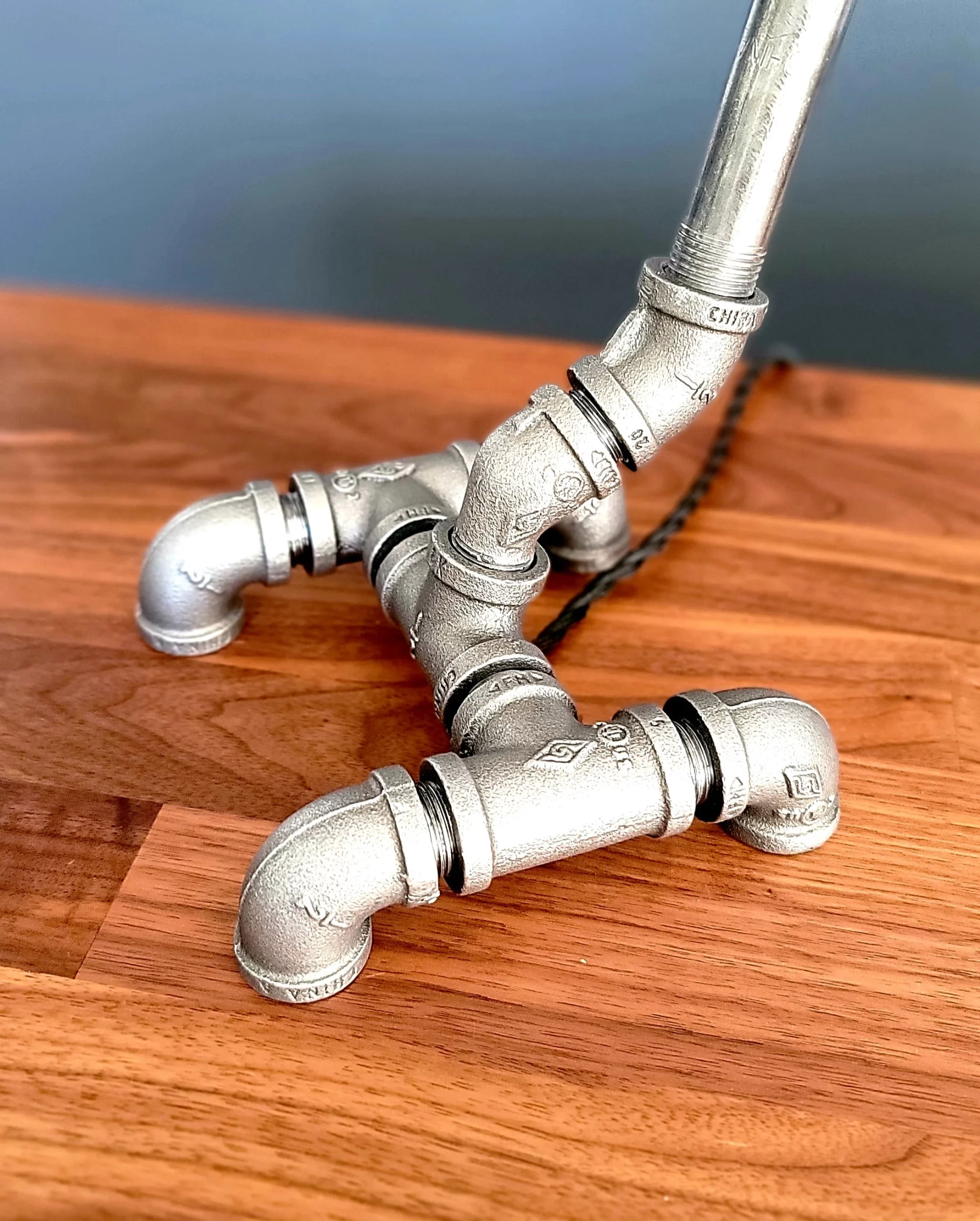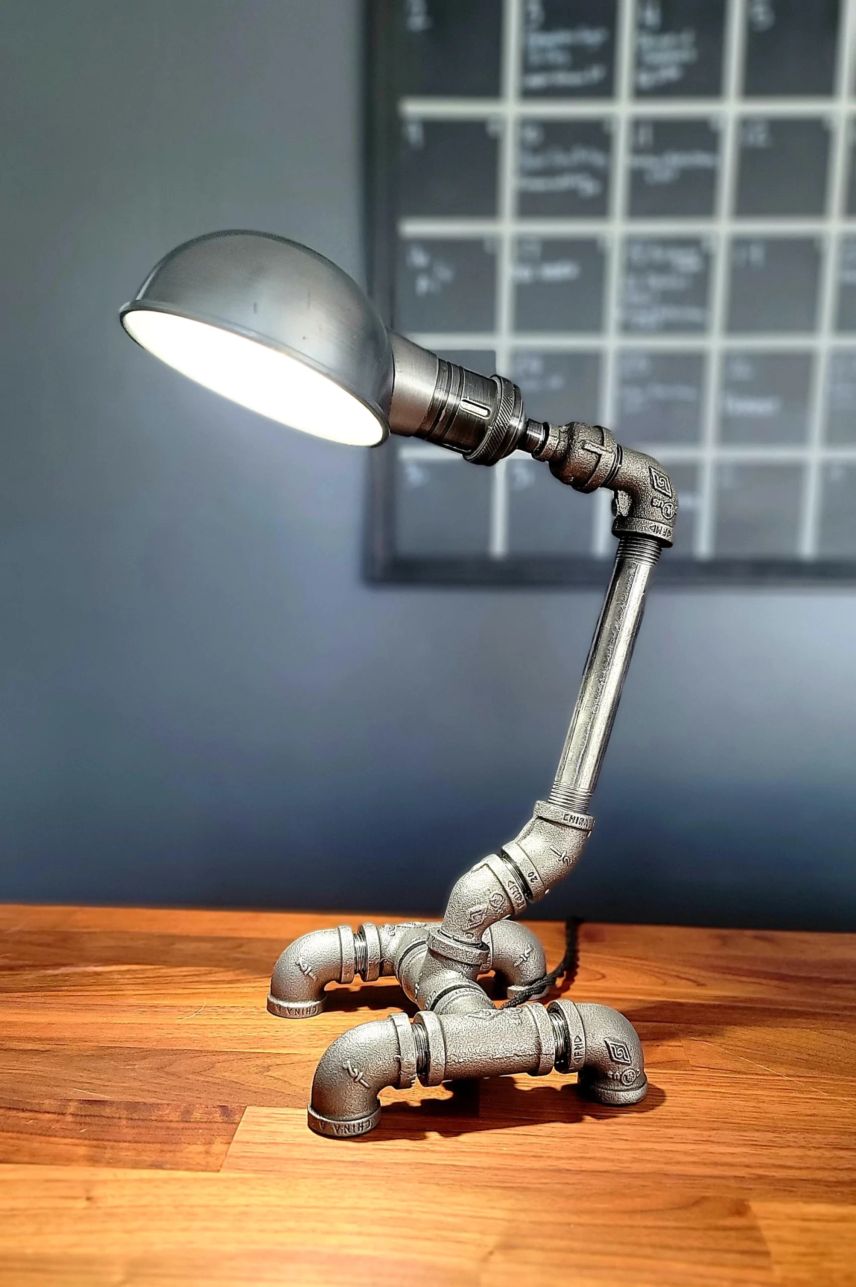 Custom handmade industrial steel pipe desk lamp with a parabolic shade.