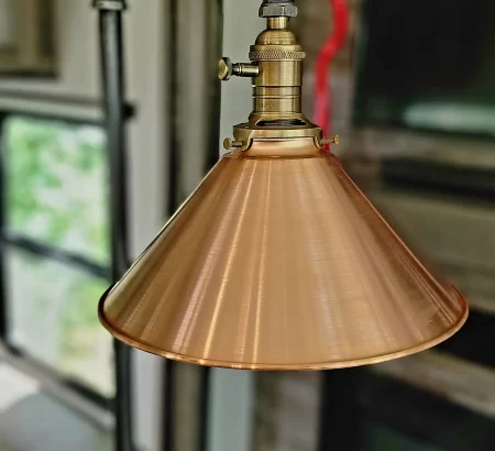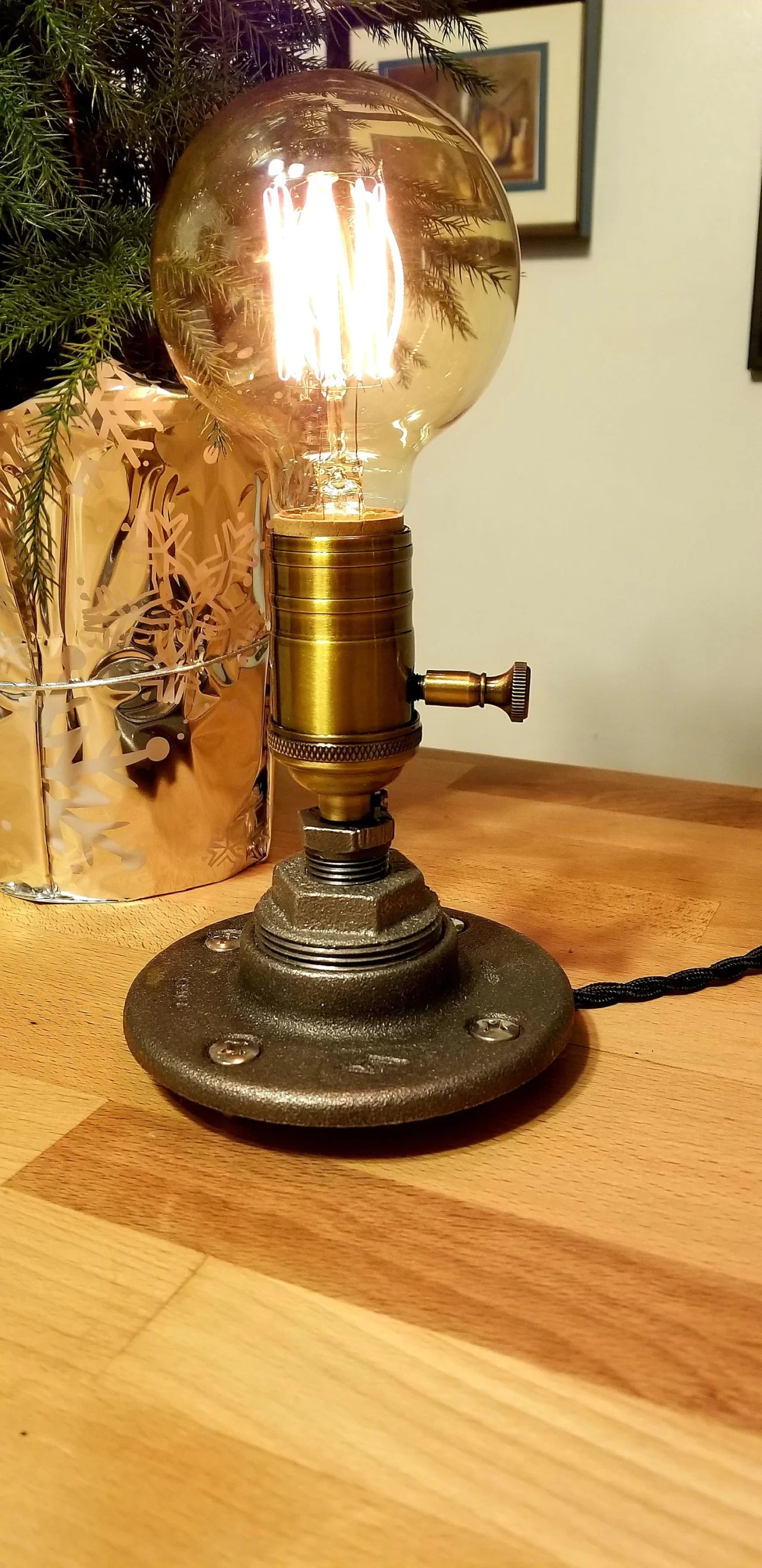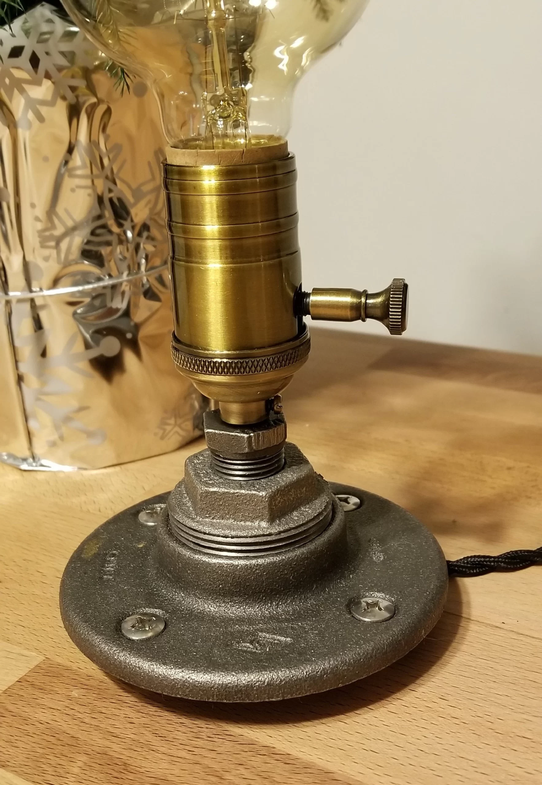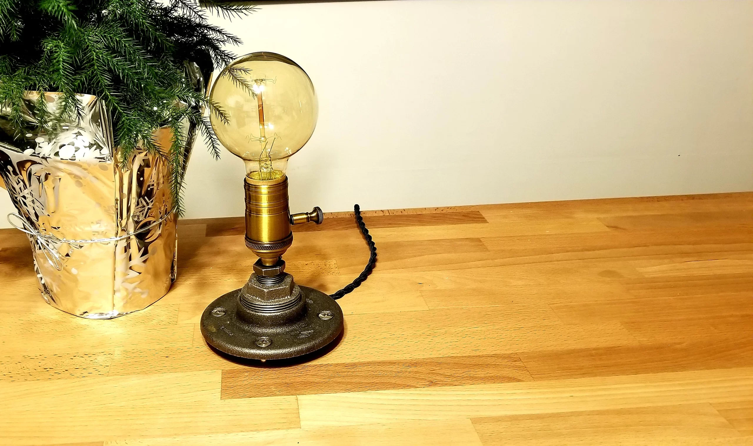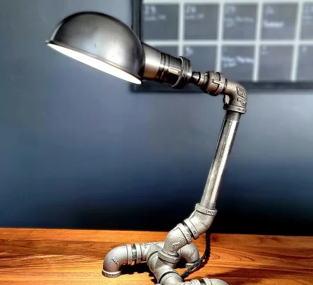 Simple elegance defines this small custom handmade industrial steel pipe desk lamp. The lamp focal point is the heavy duty stylish antiqued brass socket that comes in either a dimmer or standard three-way switch. I’ve added a large round Edison bulb to finish off the look.