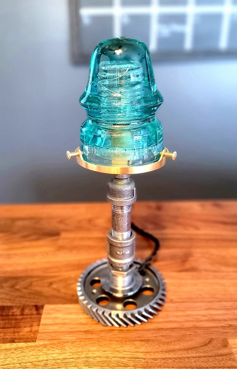 Glass Insulator Industrial Steel Pipe Gear Desk Lamp With a Brass Twist – Farmhouse Lighting